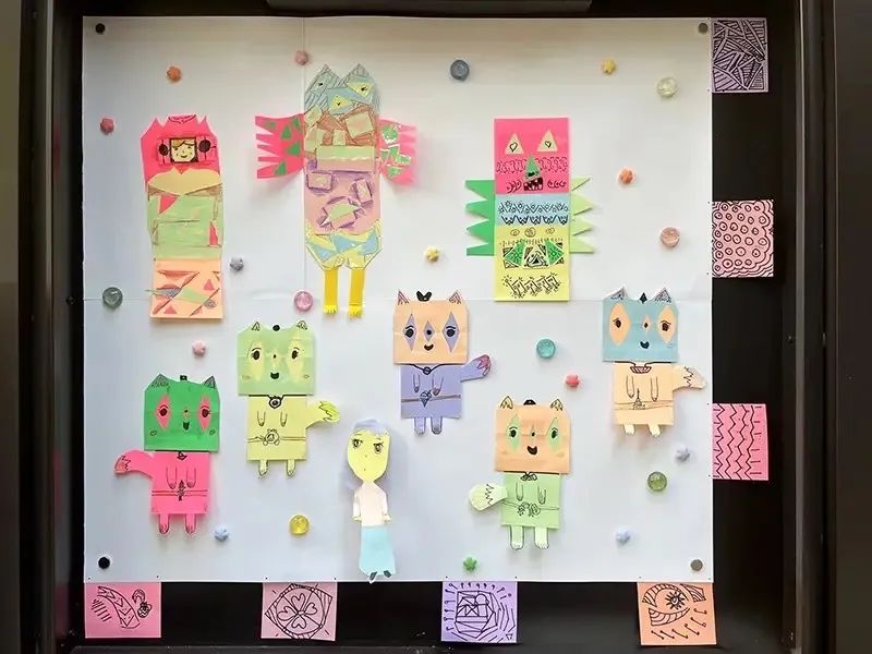 此外,定西路602號的展品《合影》、定西路710號的展品《今天對不了焦》都有著濃濃的生活氣息。前者由6歲的小女孩Luna用便利貼制作,有狐貍、小女孩、貓頭鷹、房子等卡通形象,十分富有童趣:后者則把視角投向了百潔布、塑料碗筷、橡膠玩具、積木、各類小玩具等生活中常見的物品。它們在展板上散落,仿佛也被賦予了生命,給街區增添了一份活力,路過時不妨一觀哦。