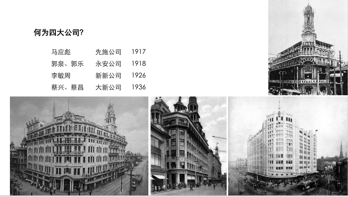 同濟大學建筑與城市規劃學院教授錢宗灝談到,華商四大百貨公司吸收了來自外商百貨公司經營全球各式各樣百貨的理念,并在這個基礎上發展出了獨有的模式。而四大百貨公司的建造本身也是一條時間軸,能看到從1917年到1935年近二十年間上海建筑風格的轉變。